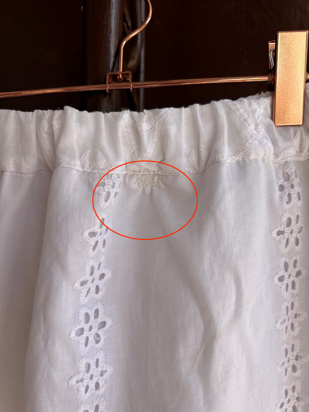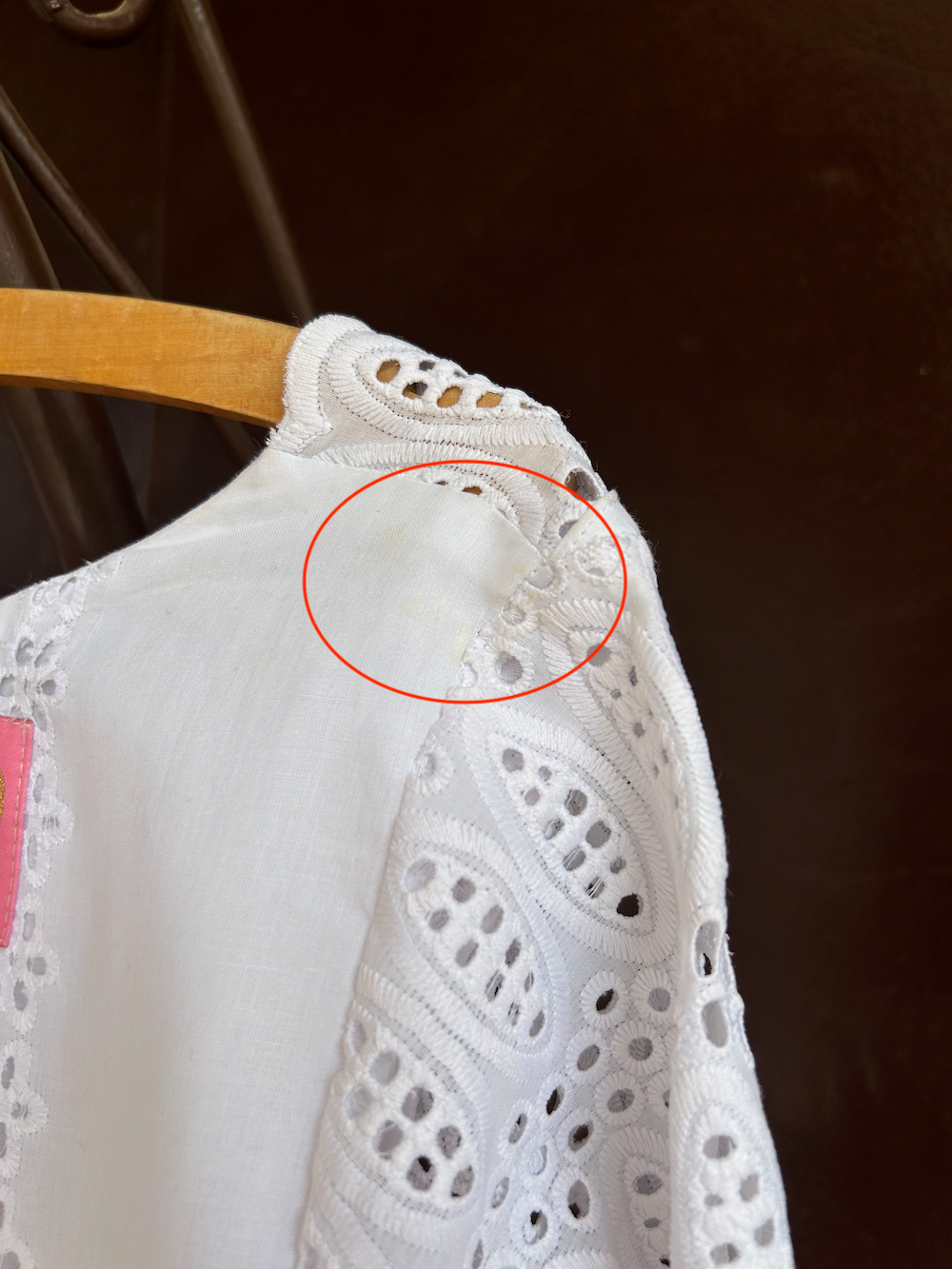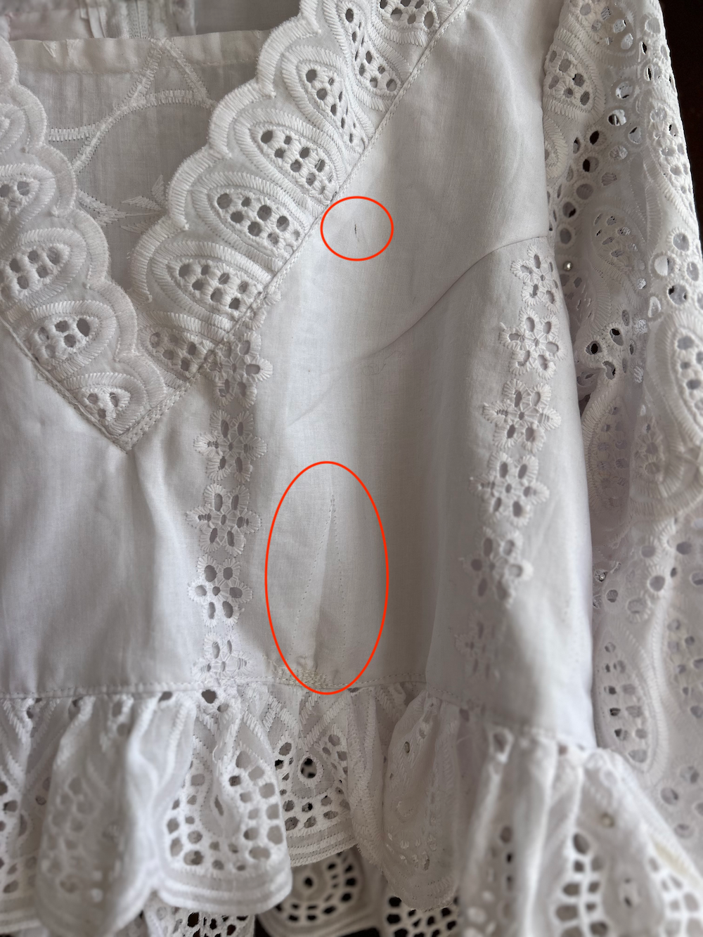 There is a slight yellowing on the right shoulder of the back bodice, which is typical of antique lace (see red circle in photo).