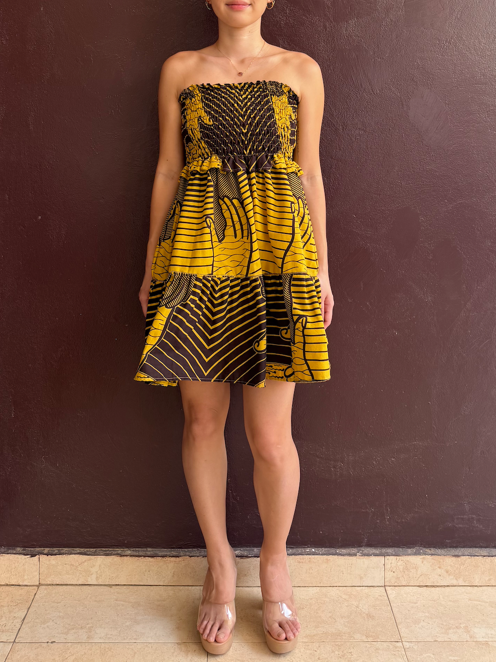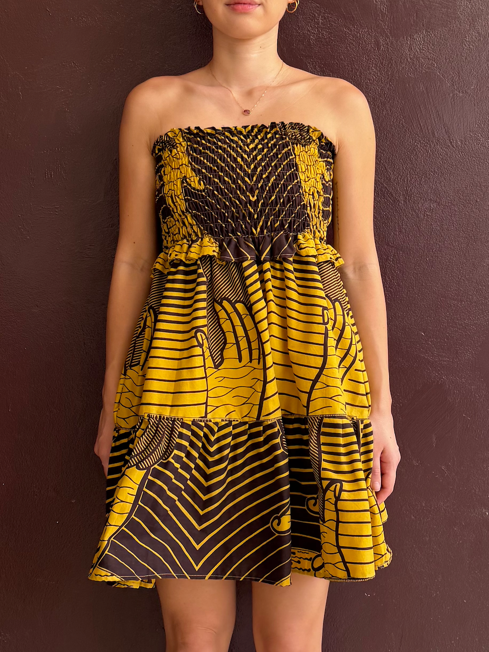 共布の肩紐付きですが、あえて内側に隠してベアトップとして着こなすのがTOUTAの提案。デコルテを潔く出すことで、大胆な柄もぐっと大人っぽく、洗練された印象に仕上がります。