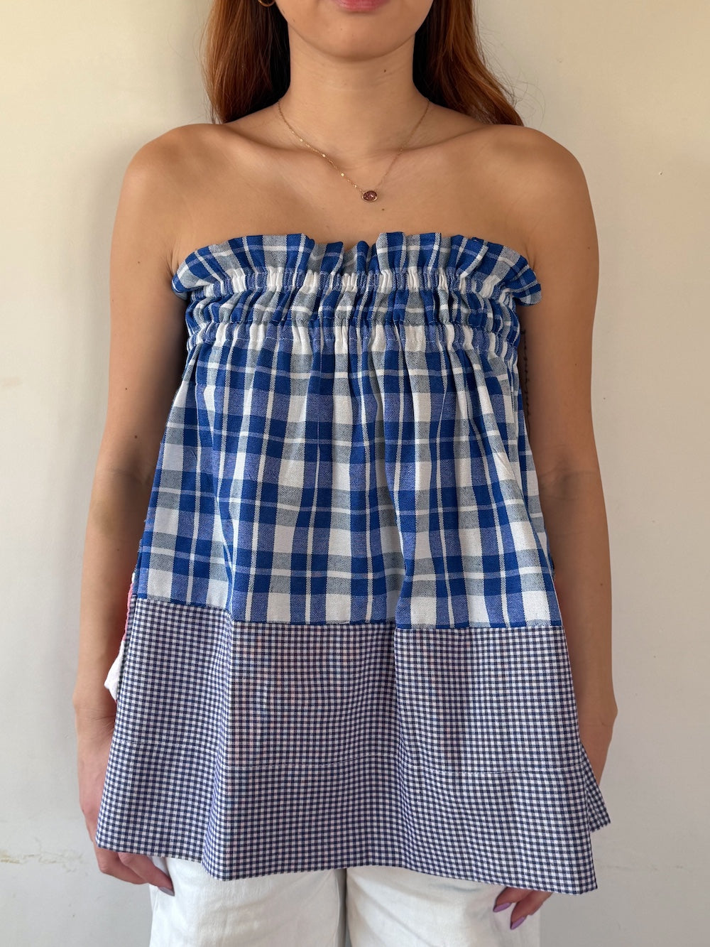Fabric: Vichy check (a cotton-linen blend that is breathable and comfortable against the skin)
