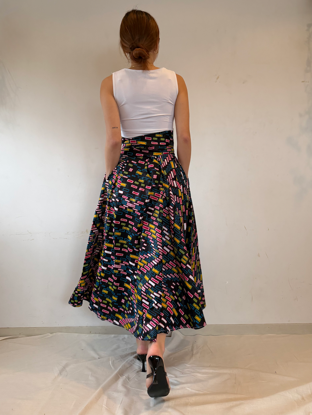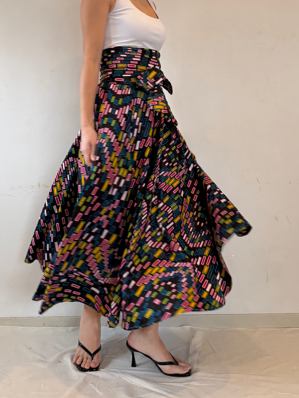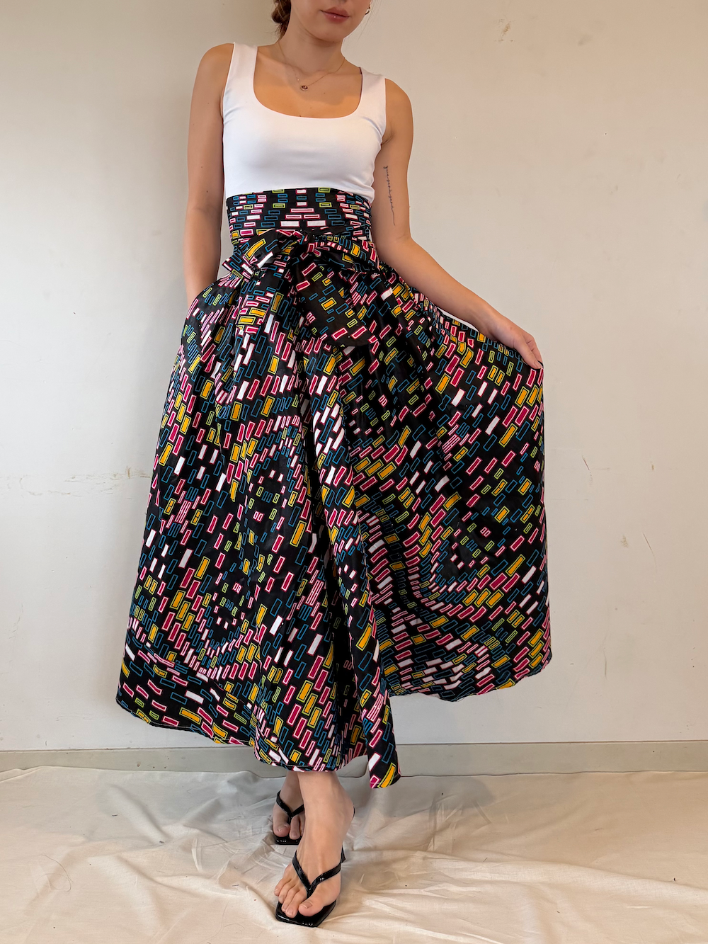 セネガルの街を彩るパワフルなアフリカンワックスプリント "Wax" を贅沢に使用したリボンスカート。