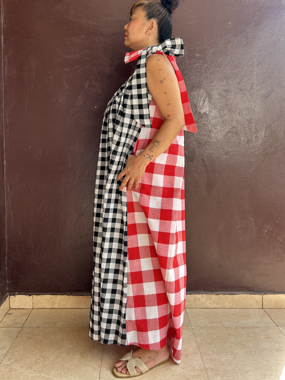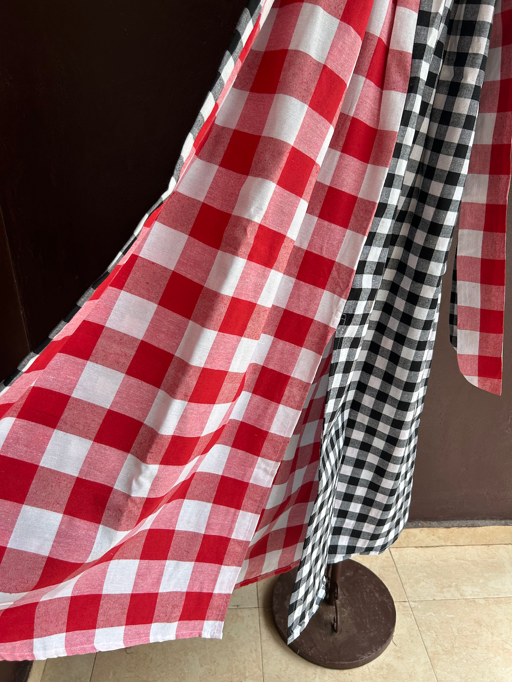 The alternating combination of red and white checks (large) and black and white checks (medium) creates a bold yet elegant impression.