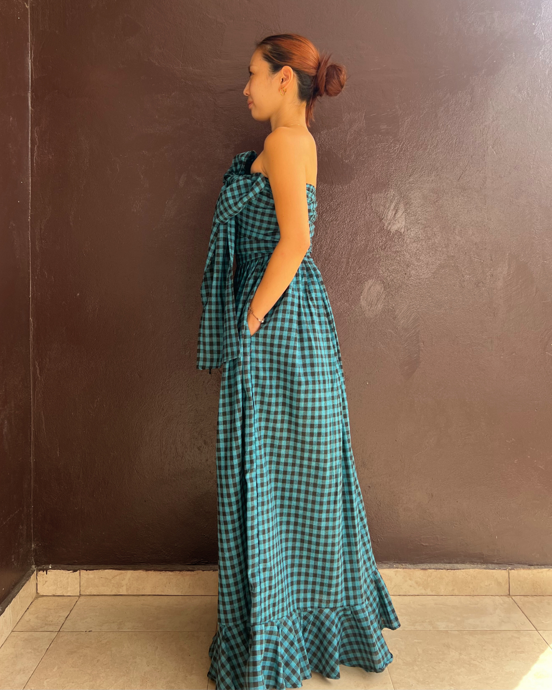 ◎ホルターネックに巻いて、大ぶりアクセでリゾートムード満点に。