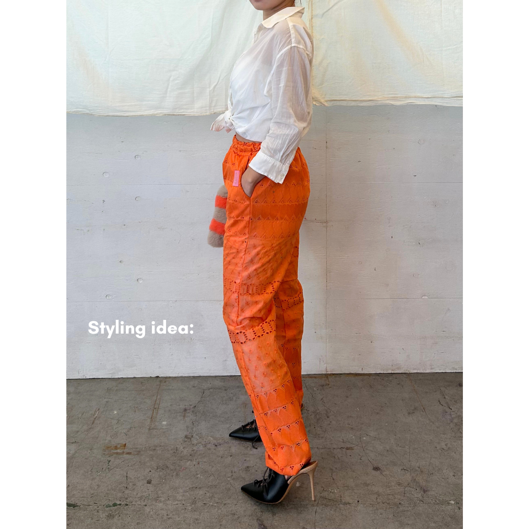 鮮やかでモードな印象のレースパンツ。
