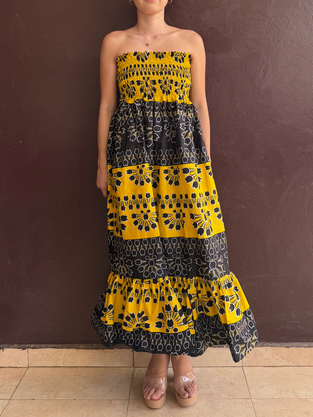 贅沢に生地を使ったLong丈は、Waxプリントの力強いエネルギーを全身で体感できる、まさに「主役」のための一着です。