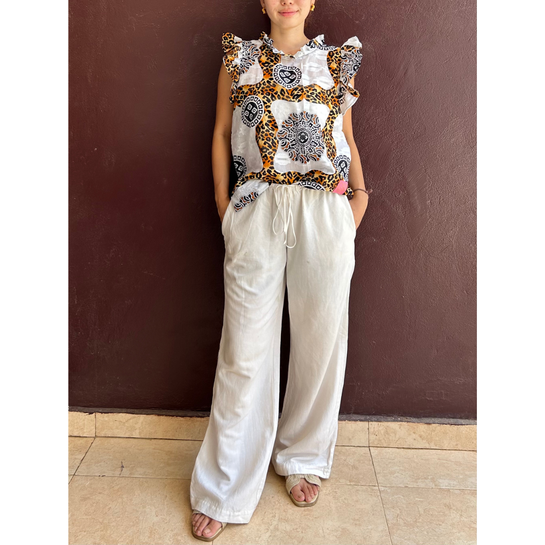 主役級の華やかなトップスなので、ボトムスはシンプルにまとめるとバランス良く着こなせます。 白やベージュ、アースカラーのリネンワイドパンツやマキシスカートと合わせると、トップスの柄が引き立ち、リラックス感のある装いに。