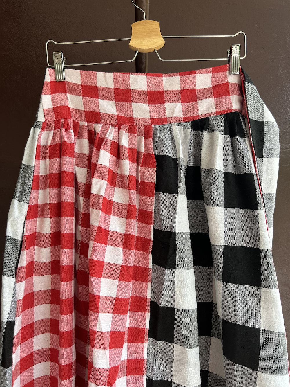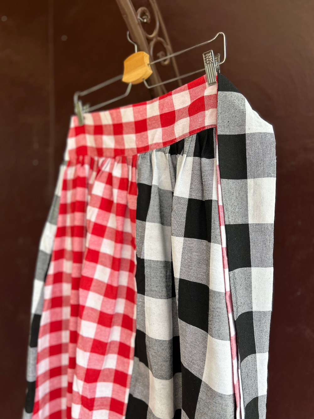 黒白チェック(大)と赤白チェック(中)を交互に組み合わせた、大胆だけどエレガントな印象が魅力。