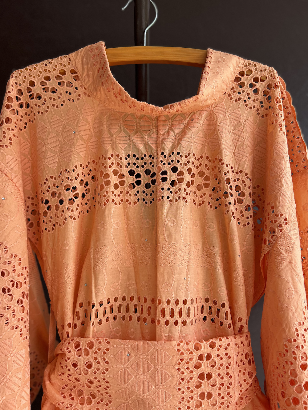 ※襟と帯ベルトも本体と同じ柄で統一感があり、スタイリングに奥行きを与えてくれます。